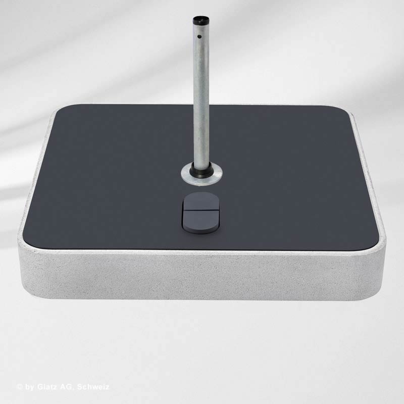 Der Glatz Rollensockel Z 55 kg ist nicht nur praktisch, sondern besticht auch durch sein Design. Glatz bietet mit diesem rollbaren Schirmständer einen vom Kunden individualisierbaren Schirmsockel an. Es kann aus zwei verschiedenen Dekoren gewählt werden. Zur Verfügung stehen die aus hochwertigem Alumium-Verbund gefertigten Dekore in den Farben seidengrau und anthrazit. Die Basis bildet ein aus Beton gefertigter Rollensockel mit der Abmessung 65 x 65 x 11 cm. Löst man die Bremse mittels des praktischen Fusspedals kann Schirm und Sockel einfach verschoben werden, eben dahin, wo der Schatten gerade gebraucht wird.