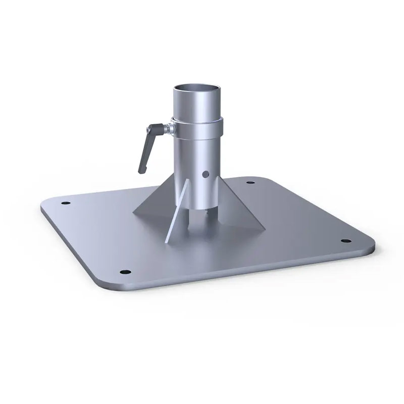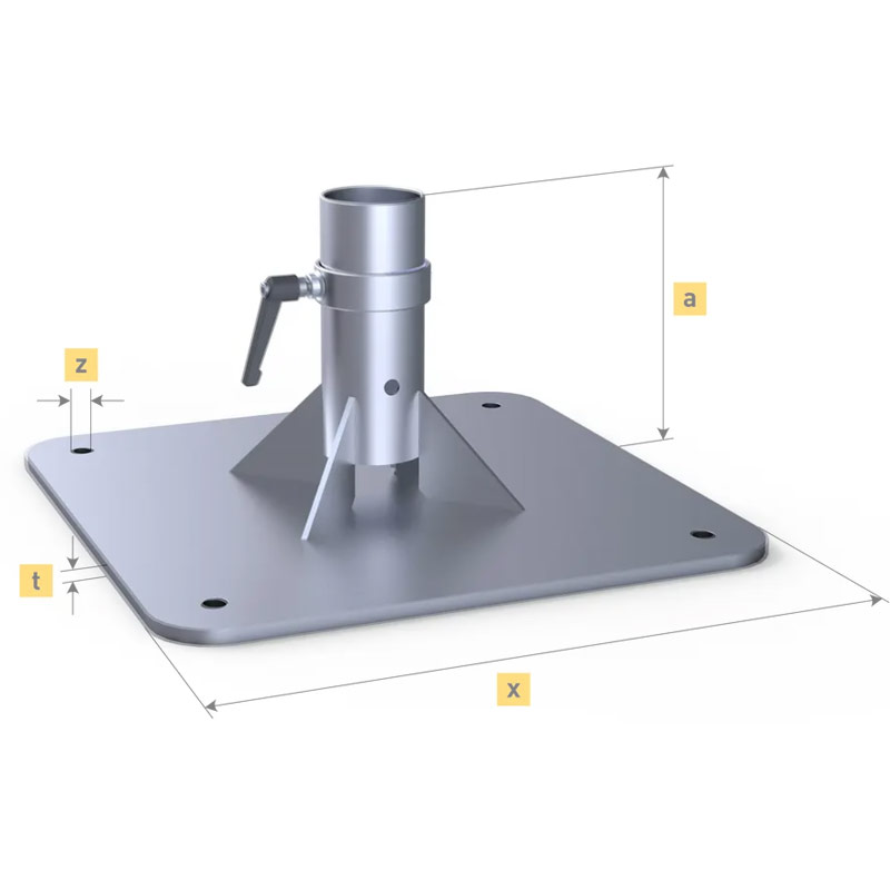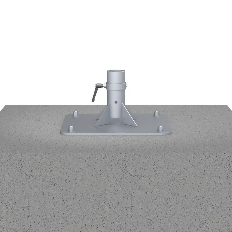 Robust, präzise und witterungsbeständig Gefertigt aus hochwertigem, verzinktem Stahl gewährleistet die Ankerplatte maximale Stabilität und Korrosionsbeständigkeit. Sie wurde speziell für die Anforderungen großer Ampelschirme wie des May Rialto entwickelt und sorgt dafür, dass Ihr Schirm auch bei wechselnden Wetterbedingungen sicher fixiert bleibt.